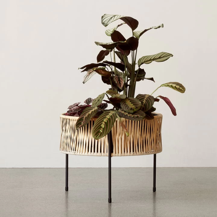 De pot is gemaakt van hoogwaardig en luxueus staal en rotan, waardoor hij geschikt is voor zowel binnen als buiten. De verhoging door de slanke poten geeft de pot een lichte uitstraling en bespaart bovendien ruimte op de vloer.