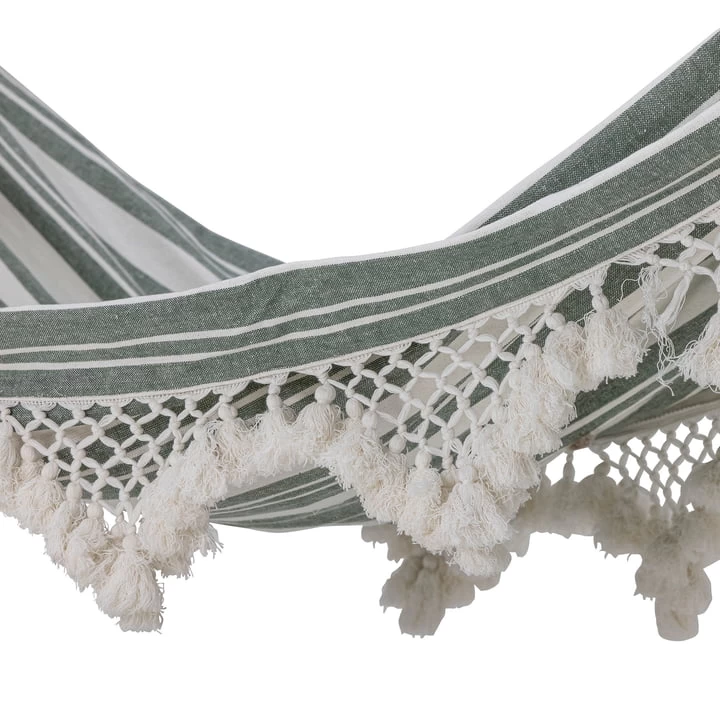 De Cruz hangmat van Bloomingville is een gezellig detail in de tuin en perfect voor warme zomerdagen. De hangmat is gemaakt van katoen in een groene tint en heeft kleine mooie details aan de zijkanten.