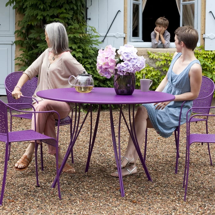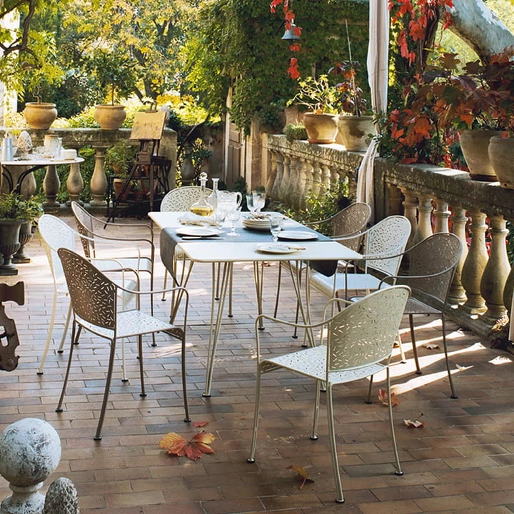 De Rendez-vous fauteuil van ontwerper Pascal Mourgue maakt deel uit van de gelijknamige serie veelzijdige tuinmeubelen met een praktisch design en een romantisch decor. Bijzonder handig: De comfortabele tuinstoel – wanneer deze niet in gebruik is – maakt het mogelijk om ondanks de armleuning eenvoudig te stapelen. Op deze manier kunnen maximaal 5 stoelen eenvoudig en veilig worden opgeborgen. Perfect voor het winterseizoen in het tuinhuisje, of om het meubilair op te slaan in openbare cafés en bistro’s.