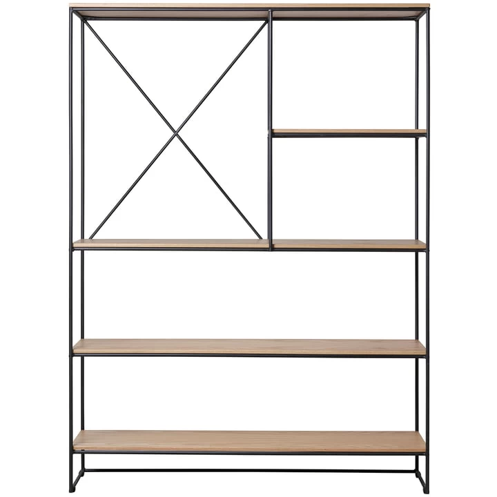De Bauhaus-geïnspireerde plank bestaat uit een gepoedercoat stalen frame met een matte afwerking. De gewrichten zijn met de hand gelast en licht afgerond om een zachte indruk te creëren. De diagonaal geplaatste staven bieden extra ondersteuning en geven de indruk van dynamiek. De planken zijn gemaakt van eikenhout met afgeschuinde randen, zodat ze naadloos in het frame passen.