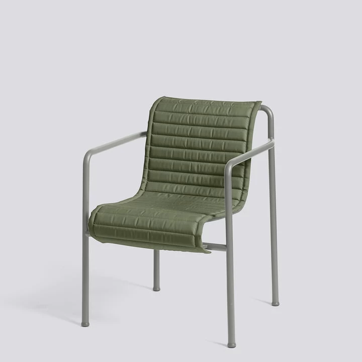 Met de Palissade Quilted Cushion van Iskos-Berlin voor Hay is de Dining Armchair Palissade Dining Armchair uit de gelijknamige collectie van Erwan & Ronan Bouroullec nu nog comfortabeler. De gewatteerde bekleding in verschillende bijpassende kleuren bestaat uit een 15 mm dikke schuimvulling en een hoes van polypropyleen. Hierdoor is het weerbestendig, waterdicht en robuust. Zelfs zonnestralen kunnen het kussen niet verkleuren.