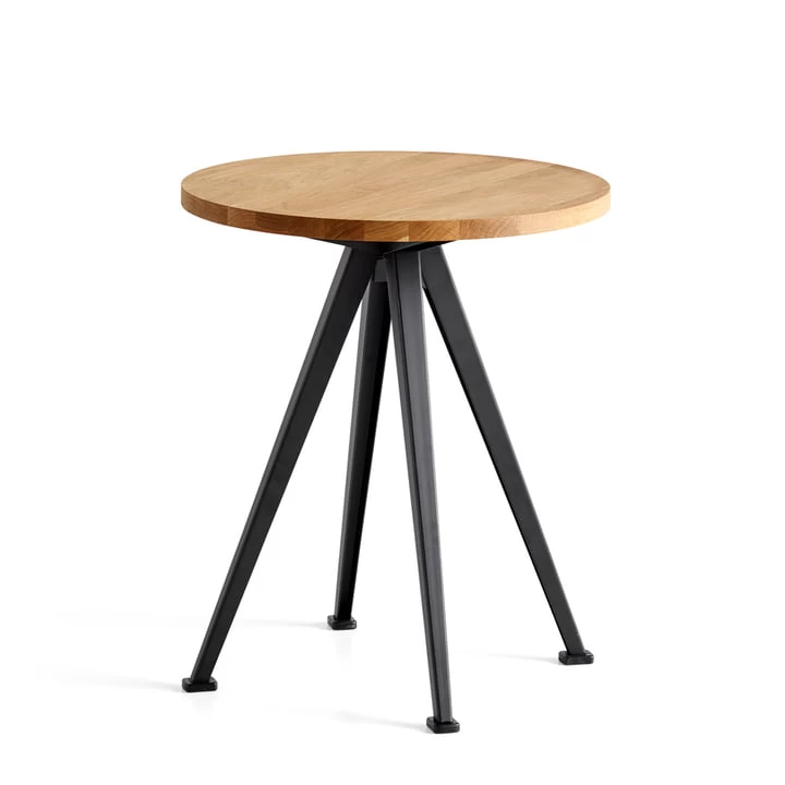 Het ontwerp van de Pyramide-koffietafel 51 valt op door zijn rustieke stijl: Het stervormige, bijna piramidevormige frame van gepoedercoat staal geeft een industriële toets. De basis wordt aangevuld met een rond tafelblad van eikenhout, dat zorgt voor een natuurlijke warmte met zijn zichtbare nerf en een prachtig contrast vormt met het koele materiaal.