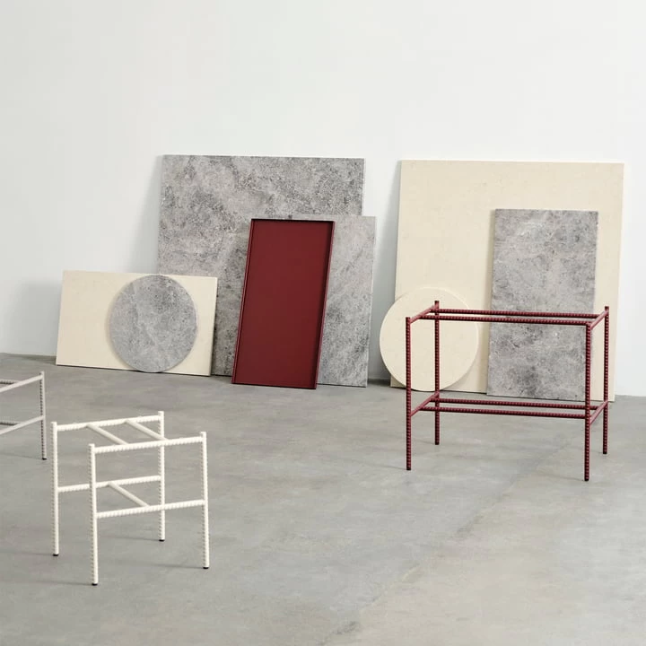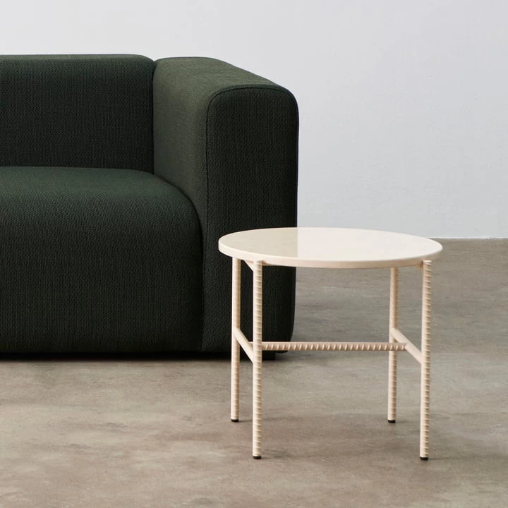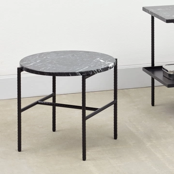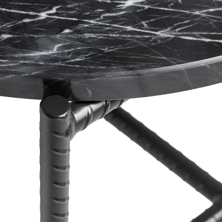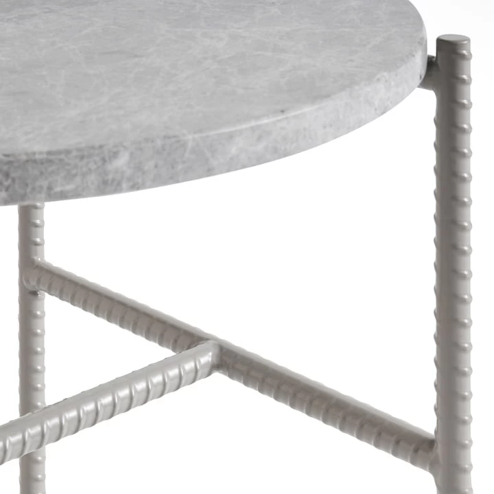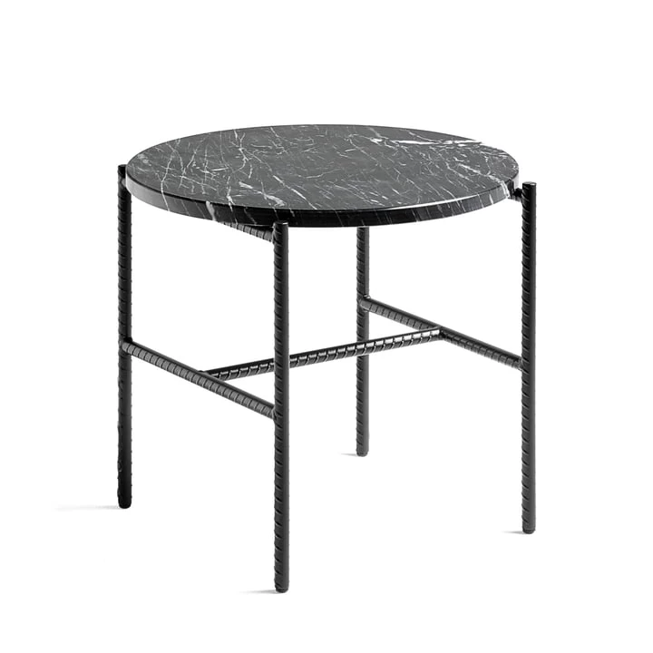 De ronde Rebar bijzettafel van Hay is ontworpen door de Belgische ontwerper Sylvain Willenz en wordt gekenmerkt door de combinatie van verschillende materialen. Gemaakt van marmer en staal – twee materialen die meestal als bouwmateriaal worden gebruikt – heeft de tafel ondanks zijn robuustheid een elegante uitstraling. De gedraaide stalen stangen vormen een onderstel met vier poten, terwijl het ronde tafelblad – afhankelijk van de uitvoering – eveneens uit gepoedercoat staal of marmer bestaat.