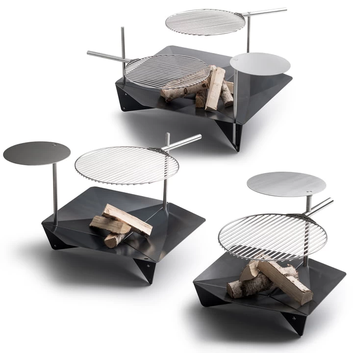Met de bijpassende accessoires, kan het vuur Triple vuurschaal kan in een handomdraai omgetoverd worden tot een barbecue. De Triple staaf , die eenvoudig in het daarvoor bestemde gat in de hoek wordt geplaatst, vormt de basis en houdt het grillrooster op de gewenste hoogte boven het vuur. Een kleine tafel kan ook afzonderlijk worden gekocht en dient als een praktische plank voor gegrilde gerechten of drankjes. Wordt hij echter boven de haard gedraaid, dan fungeert hij als een soort kookplaat waarop bijvoorbeeld vurige stoofpotten kunnen worden bereid.