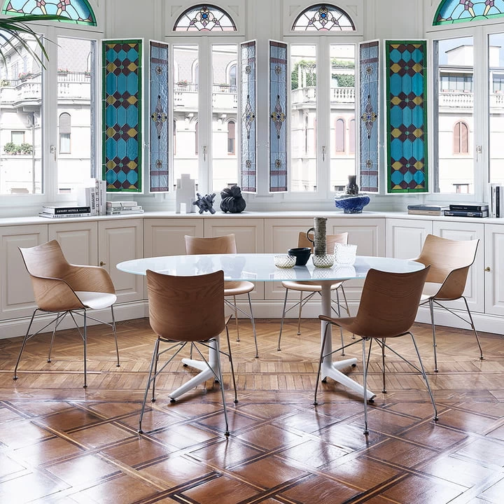 De Q/Wood fauteuil van Kartell is een tijdloze en elegante stoel met armleuningen, die zowel alleen als in groepsverband aan de eettafel een blikvanger is. De stoel overtuigt door zijn zachte rondingen en de filigrane poten. Q/Wood is ontworpen door Philippe Starck als onderdeel van de Smart Wood-serie. De serie omvat zitmeubelen met houten zitschalen die met innovatieve 3D-technologie optimaal gebogen zijn en zich zo perfect aan het lichaam aanpassen.
