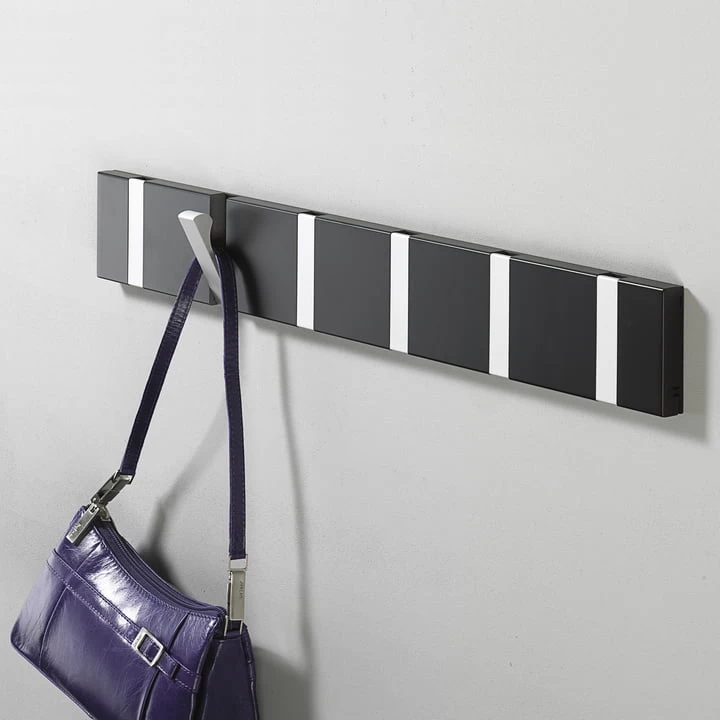 Wanneer de aluminium haken niet in gebruik zijn, kunnen ze dankzij een kleine trekveer automatisch teruggevouwen worden. Een verborgen metalen achterkant zorgt voor stabiliteit en een eenvoudige wandmontage.