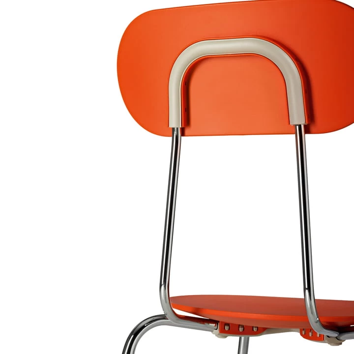 Deze ogenschijnlijk eenvoudige stoel in jaren ’50 stijl heeft een zitting en rugleuningen die niet met schroeven of klinknagels aan het frame zijn bevestigd, maar verbinden de zitting en rugleuning met het frame met een serie gegoten kunststof ribben. De poten zijn fijner en nauwkeuriger in vergelijking met de stoelen uit de jaren 50 en zorgen voor een filigraan uiterlijk.