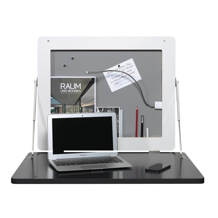 Flatframe is ook verkrijgbaar met een eenvoudig wit frontoppervlak: Als het bureau niet wordt gebruikt, verdwijnt het door de hele diepte van 4.5 cm alsof het deel uitmaakt van de muur. Deze versie kan gebruikt worden als staande of zittende werkplek, afhankelijk van de montagehoogte.