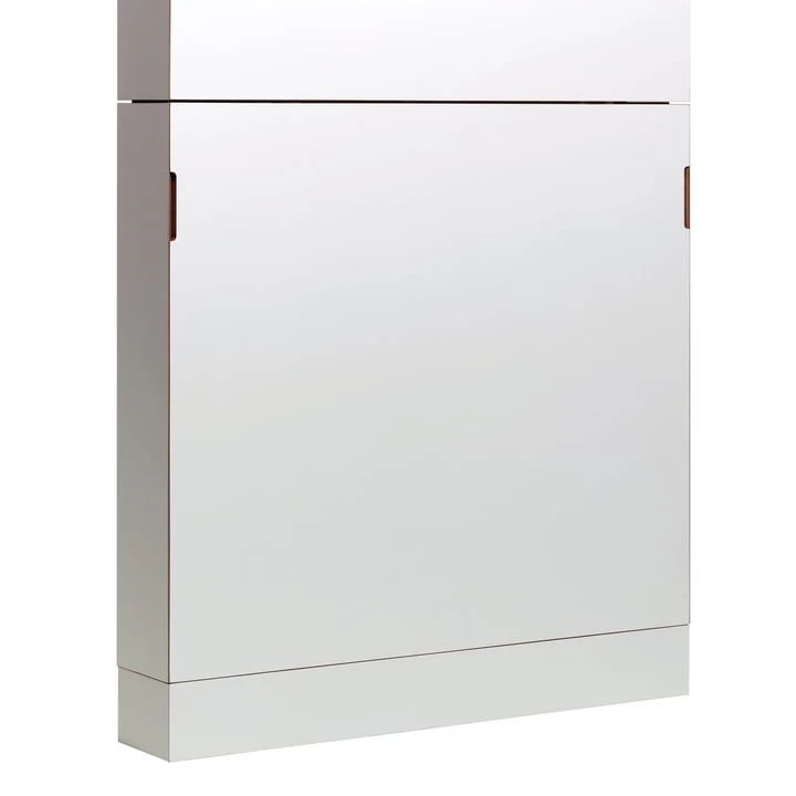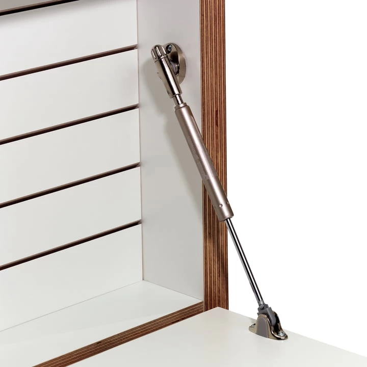 In het bovenste gedeelte wordt de secretaire aan de muur bevestigd met behulp van een wiggenstrip met 2 schroeven. De wandbevestiging creëert een 10 mm brede schaduwvoeg tussen de wand en het meubel; de totale diepte van de secretaire bedraagt dus slechts 132 mm. Hij is verkrijgbaar in verschillende kleuren en materiaalafwerkingen.