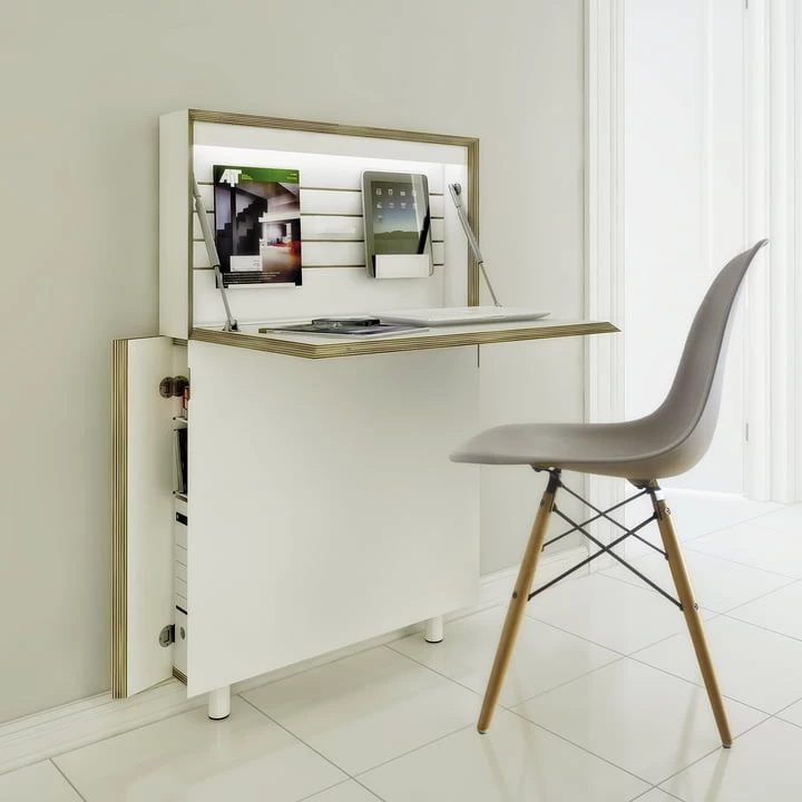 De Flatmate De secretaire van Müller Small Living is waarschijnlijk de kleinste volledig uitgeruste secretaire op de markt. Met zijn minimalistische ontwerp en geringe diepte past hij zelfs in de kleinste Flatmate Hij past zelfs in de kleinste ruimte en biedt opberg-, archiverings- en schrijfruimte.