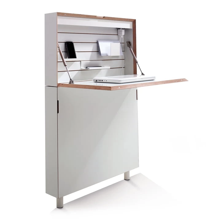 Ontwerper Michael Hilgers heeft Flatmate heeft de secretaire als meubelstuk volledig geherinterpreteerd en heeft de snaar van de tijd geraakt: de secretaire is ideaal voor iedereen die mobiel werkt en leeft. Flatmate Het past in elk interieurontwerp en integreert de eisen van werken en wonen in een netwerk: Afhankelijk van de eisen kan de Flatmate Afhankelijk van de behoefte biedt de secretaire opbergruimte voor een klassiek notitieblok, een tablet-pc en een iPad & . Natuurlijk is er ook plaats voor klassiek schrijfgerei.