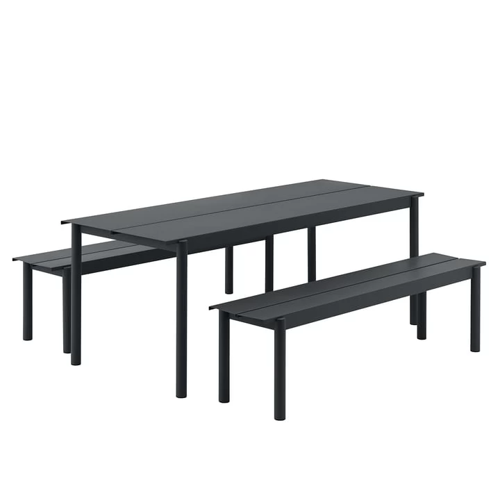 De bank is beschikbaar Linear Steel bank van Muuto is verkrijgbaar in verschillende sterke en ingetogen kleuren. Met de bijpassende Linear Steel tafel om een harmonieuze zitset voor de buitenruimte te creëren.