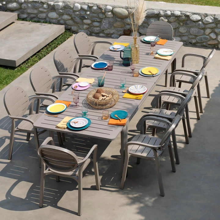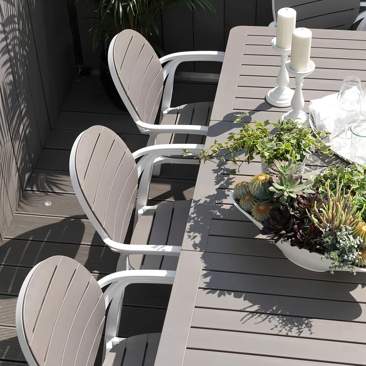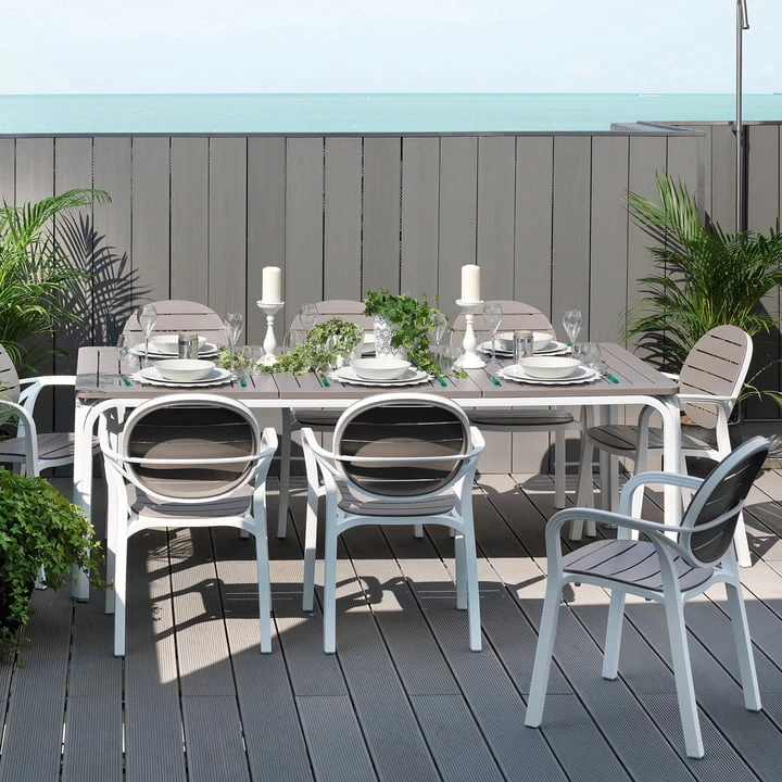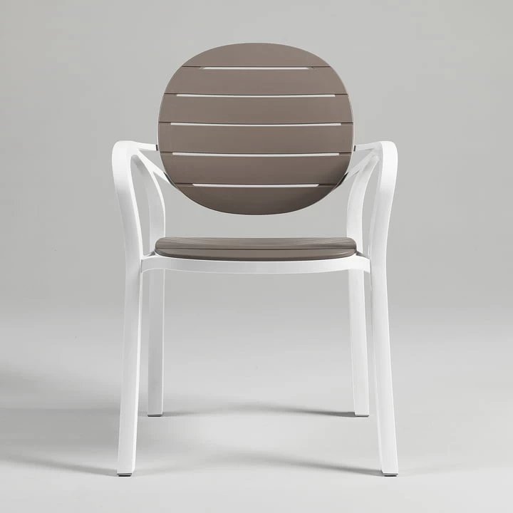 De Palma fauteuil van Nardi heeft een typisch Italiaanse uitstraling die elk balkon of terras op stijlvolle wijze zal aanvullen. De zitting en rugleuning bestaan uit brede duigen van met glasvezel versterkte kunststof. De poten vertakken zich in smalle stroken bij de zitting en de rugleuning. Palma is lichtgewicht en stapelbaar.