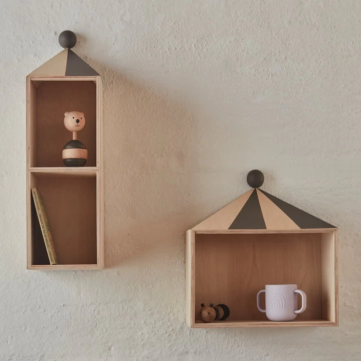 Met een dak als een circustent overtuigt het speelse ontwerp van de plank Circus van OYOY . Als ideaal wandaccessoire voor de kinderkamer laat het de ogen van kinderen sprankelen. Afhankelijk van de uitvoering kunnen allerlei kleine voorwerpen zoals boeken, knuffels en speelgoed op één of twee niveaus worden opgeborgen.