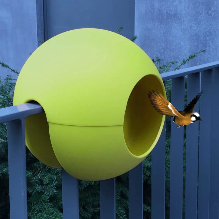 Het bolvormige vogelkastje heeft twee ronde openingen aan de zijkanten waardoor de vogels in de winter bij het voedsel kunnen komen. Zo kunt u vanuit uw luie stoel toekijken hoe de diertjes aan het graan pikken. In tegenstelling tot de bloomball heeft de birdball geen pluggen; het water kan dus te allen tijde ongehinderd wegstromen.