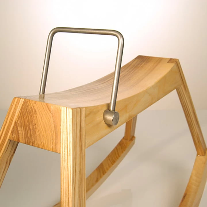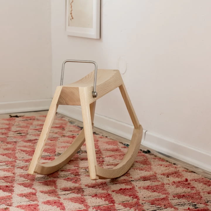 Het lichaam van het hobbelpaard is gemaakt van massief essenhout, het handvat is gemaakt van roestvrij staal.