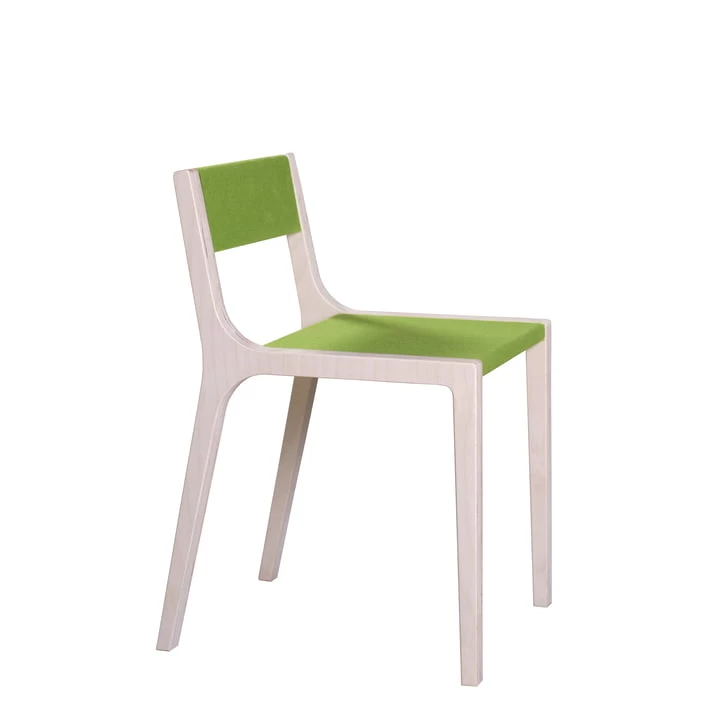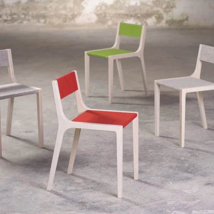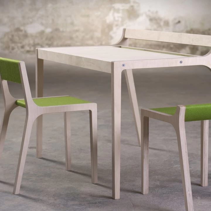 Zitting en rugleuning zijn bekleed met vilt in een kindvriendelijke kleur. Het vilt brengt een vleugje kleur in de houten wereld van Sepp en zorgt er tegelijkertijd voor dat kinderen niet heen en weer glijden op de zitting.