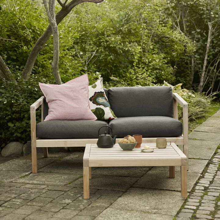 Het teakhout van het frame is afkomstig uit duurzame bosbouw. Aangevuld met de weerbestendige Barriere Panama kussens, nodigt de Virkelys sofa uit tot lezen en comfortabel vertoeven in de zomer.