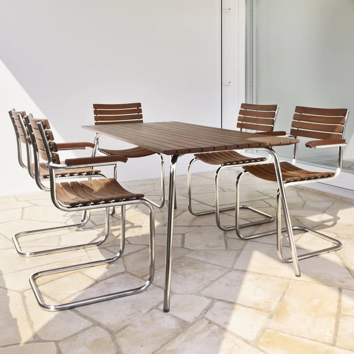 De tuintafel S 1040 uit de All Seasons collectie van Thonet kenmerkt zich door zijn robuuste en toch elegante uitstraling. Het tafelblad is gemaakt van Afrikaans Iroko hout (FSC®-keurmerk), dat zich kenmerkt door zijn hoge dichtheid en absolute weerbestendigheid. Het hout is daarom uitermate geschikt voor buitengebruik en kan uitstekend worden gecombineerd met andere tuinmeubelen uit de All Seasons collectie.