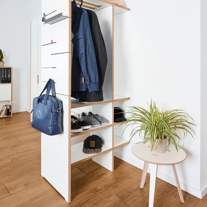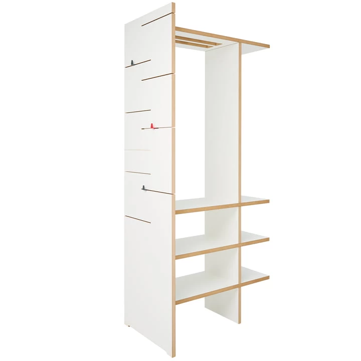 De kapstok is samengesteld uit stevige houtvezelplaten. Subtiele gleuven aan de buitenzijden kunnen worden voorzien van meerkleurige haken van metaal, waaraan extra jassen kunnen worden gehangen. De legplank kan net als de haken gewoon in de gleuven aan de zijkant van de kapstok worden geschoven en naar wens worden geplaatst