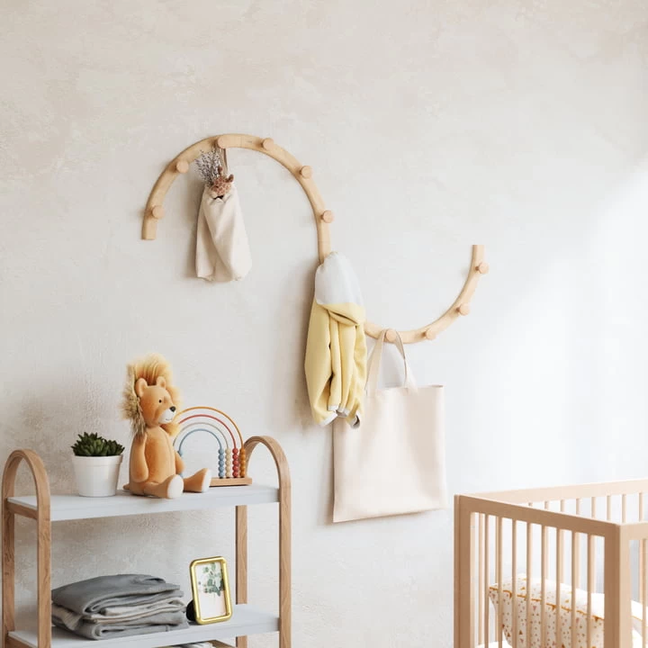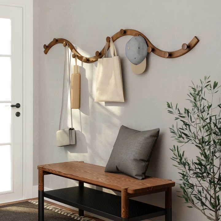 De kapstok Slinka van de Canadese fabrikant Umbra overtuigt door zijn veelzijdigheid. Hij kan in vier verschillende configuraties worden opgesteld dankzij de modulaire boogvormige elementen. Elk van de wandelementen heeft drie haken, zodat in totaal twaalf haken kunnen worden gebruikt. Elke haak kan 2,3 kg dragen of elk wandelement 6,8 kg. De afgeronde hoeken en het mooie houten oppervlak creëren een edele sfeer in uw woonkamers. De afzonderlijke woonelementen kunnen naar eigen wens worden ingericht. In de gang voor het ophangen van jassen of in de slaapkamer als decoratief element.