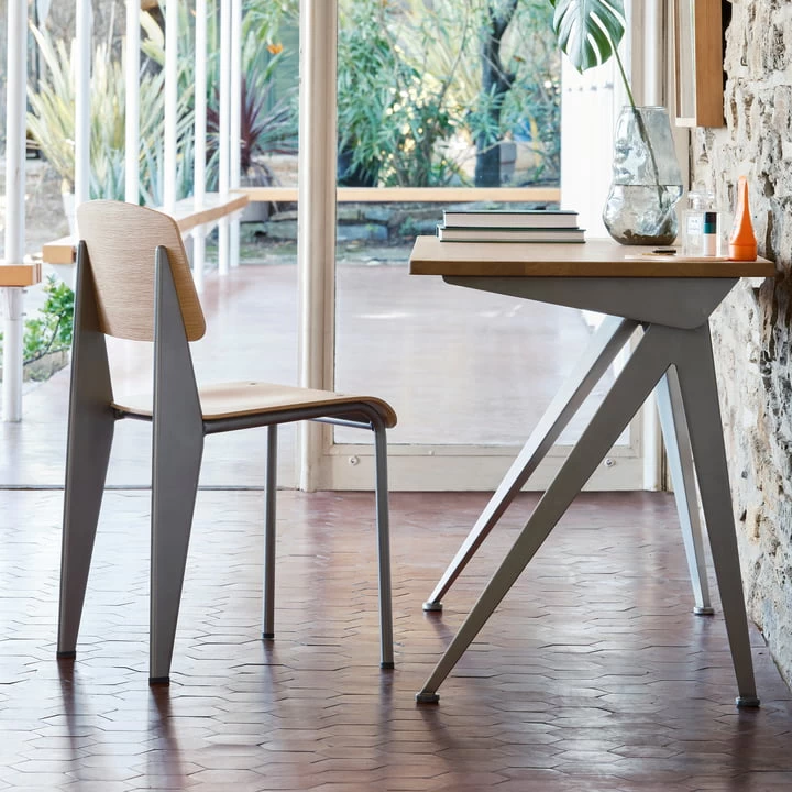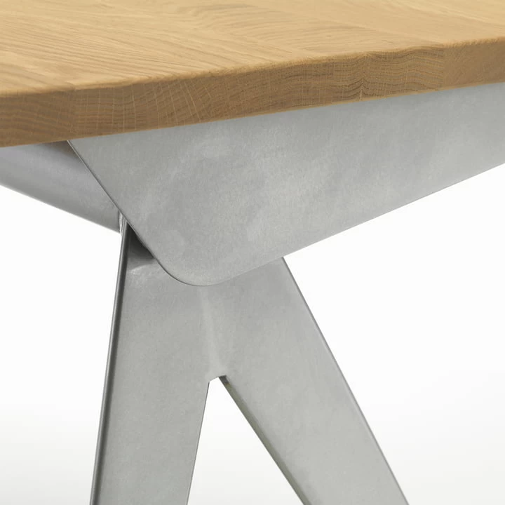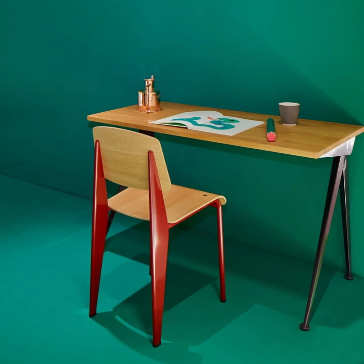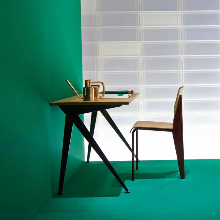 Vitra vervaardigt de herziene Compas Direction van gepoedercoat staal en een massief blad van geolied eikenhout. Het natuurlijke materiaal vormt een spannend contrast met het basaltkleurige onderstel, waardoor het bureau van Jean Prouvé een opvallende maar ingetogen elegantie krijgt.
