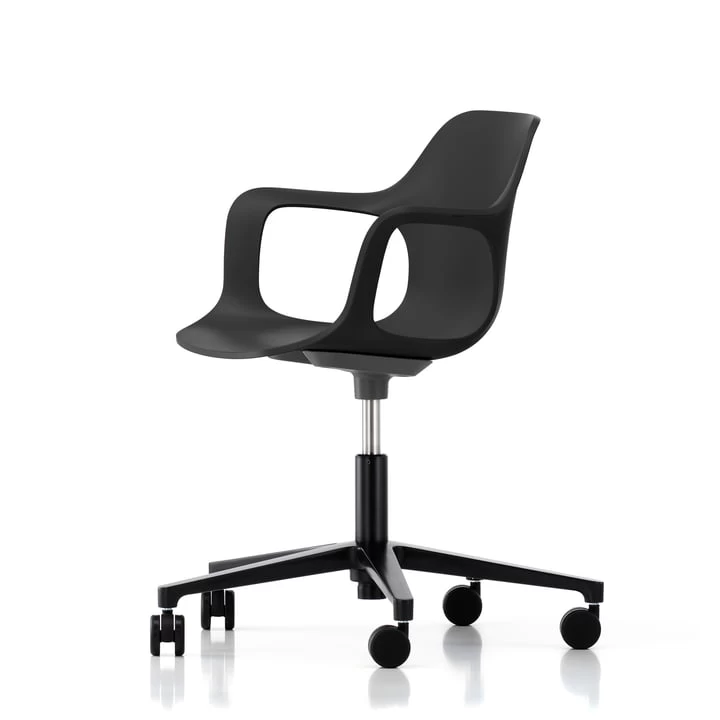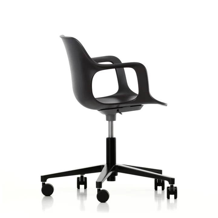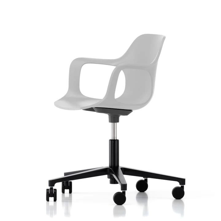 De moderne Hal-draaistoel heeft een vijf sterren onderstel van gegoten aluminium en is multifunctioneel – op kantoor, maar ook op openbare of particuliere plaatsen. De vorm van de zitschaal maakt bewegingsdynamiek mogelijk en de licht buigzame kunststof maakt verschillende zitposities mogelijk, terwijl de armleuningen het comfort maximaliseren. Zo bevordert de Vitra Hal het dynamisch en ergonomisch zitten.