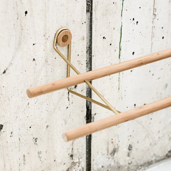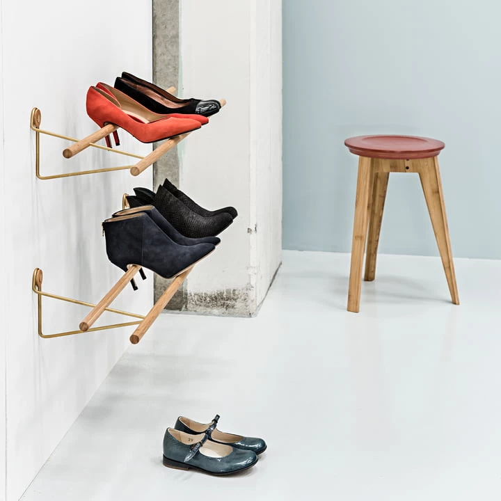 Het schoenenrek is gemaakt van FSC-gecertificeerd eikenhout of bamboe en van staal of messing en is verkrijgbaar in verschillende afwerkingen.