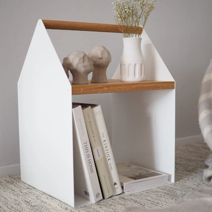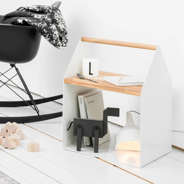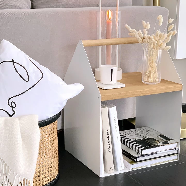 Het lichaam van gepoedercoat staal wordt ondersteund door een “dak” van natuurlijk hout, dat bestaat uit een opbergvlak en een draaggreep. Zo kan de bijzettafel indien nodig in een paar stappen worden verplaatst. De combinatie van natuurlijk hout en helder wit is typisch Scandinavisch.